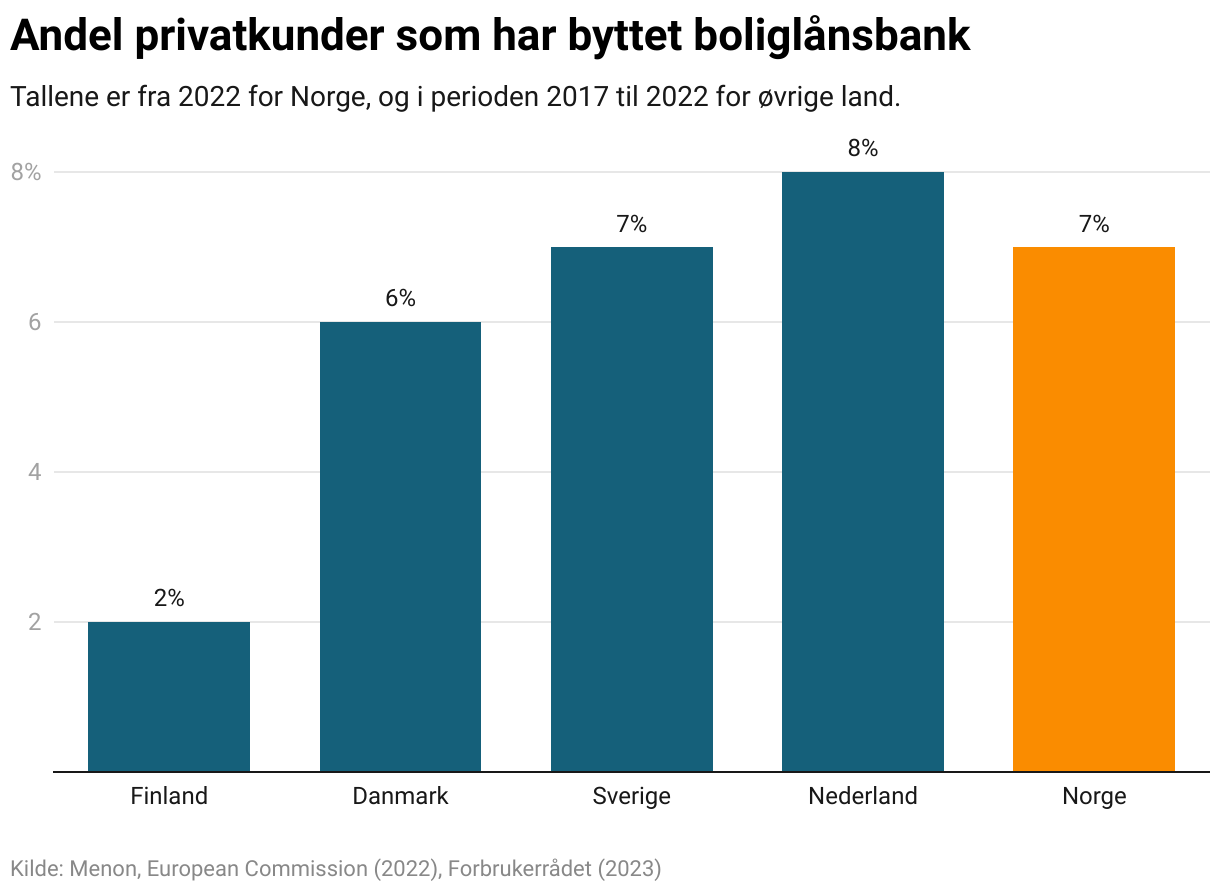 Norge har også høy kundemobilitet på boliglån sammenlignet med øvrige land. I 2022 byttet kunder i Norge boliglånsbank i like stor grad som kunder i øvrige land gjorde i løpet av de siste 5 årene