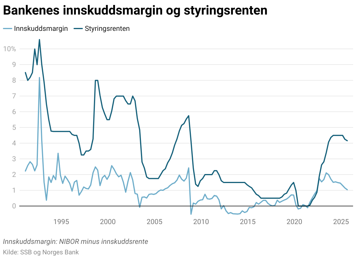 En vesentlig faktor bak denne positive utviklingen er en markant økning i innskuddsmarginen. Deler av økningen i innskuddsmarginen kan forklares med økt rentenivå og styringsrente. Innskuddsmarginen ble negativ under pandemien da Norges Bank reduserte styringsrenten til null og bankene ikke ville kreve betaling for innskudd. Da Norges Bank satte opp styringsrenten igjen, økte innskuddsmarginen. Økt rentenivå har også økt bankenes inntjening på egenkapitalfinansierte eiendeler, der økte renteinntekter fra høyere rentenivå ikke blir utlignet med høyere rentekostnader.