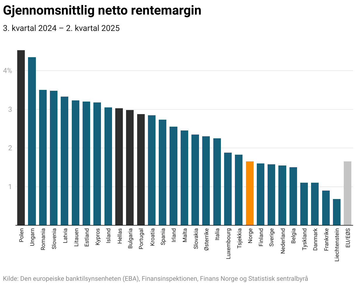 Den lave kostnadsgraden har igjen kommet de norske bankkundene til gode gjennom lavere priser. Norske banker har en relativt lav netto rentemargin i forhold til andre land i Europa. Det er også verdt å merke seg at landene med lavere kostnadsgrad enn Norge, det vil si Hellas, Portugal, Bulgaria og Polen har nesten dobbelt så høy netto rentemargin som Norge. Det gir bankene i disse landene høye inntekter i forhold til kostnadene og dermed en lav kostnadsgrad.