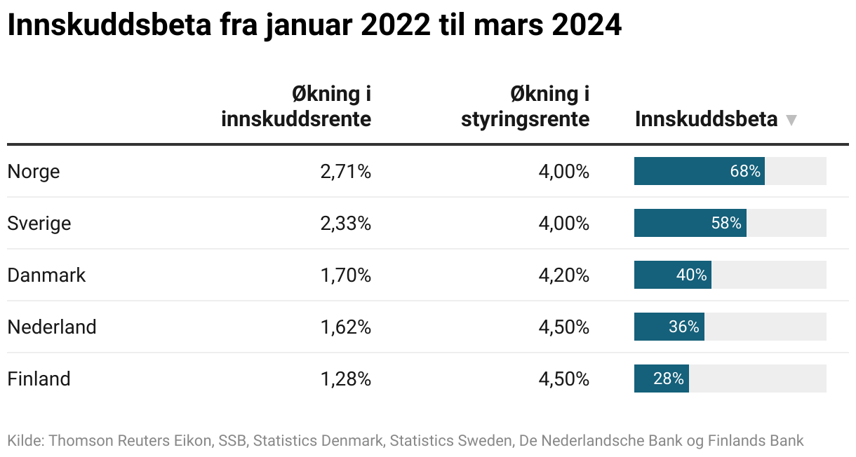 Innskuddsbeta er et mål på hvor stor andel av endringer i Norges Banks styringsrente som bankene overfører til sine kunders innskuddsrenter. En innskuddsbeta på 100% indikerer at bankenes innskuddsrenter endres i takt med styringsrenten, mens en beta på 50% betyr at bare halvparten av endringen overføres.
