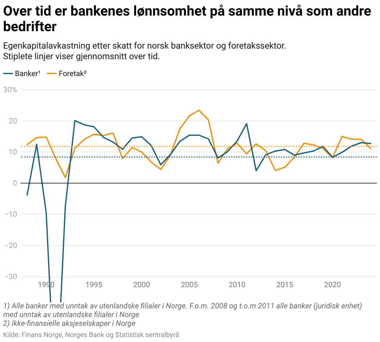Over tid er de norske bankenes lønnsomhet på samme nivå som for vanlige ikke-finansielle foretak. Den norske banksektoren har hatt en gjennomsnittlig egenkapitalavkastning på 8 % siden 1988. Tilsvarende måltall for vanlige foretak er 12 %. I tillegg varierer egenkapitalavkastningen til bankene mer enn for vanlige foretak. Risikojustert avkastning i de norske bankene er derfor ikke høy i forhold til vanlige foretak.