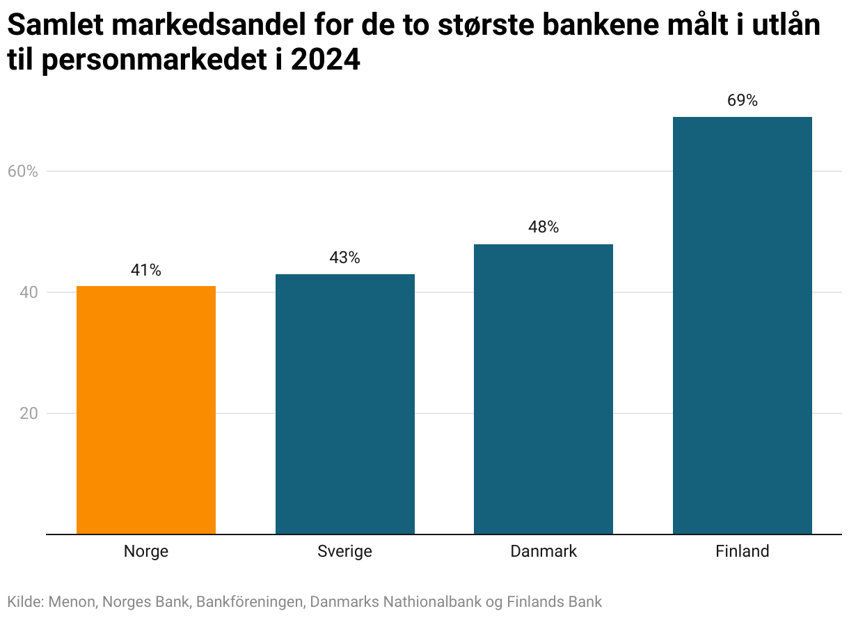 Norsk banksektor er relativt lite konsentrert i forhold til sammenliknbare land. Det indikerer at de største bankene i Norge har relativt lav markedsmakt, noe som er bra for konkurransen. De to største bankene i Norge har en lav samlet marksandel i personmarkedet sammenlignet med de to største bankene i øvrige land.